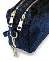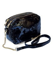 Musta käärmeennahkakuvioinen käsilaukku kahdella metallivetoketjulla ja pitkällä olkaketjulla. Näyttävä laukku arkeen tai juhlaan.