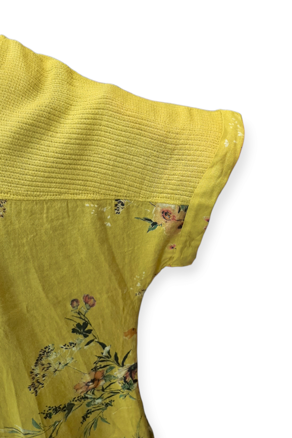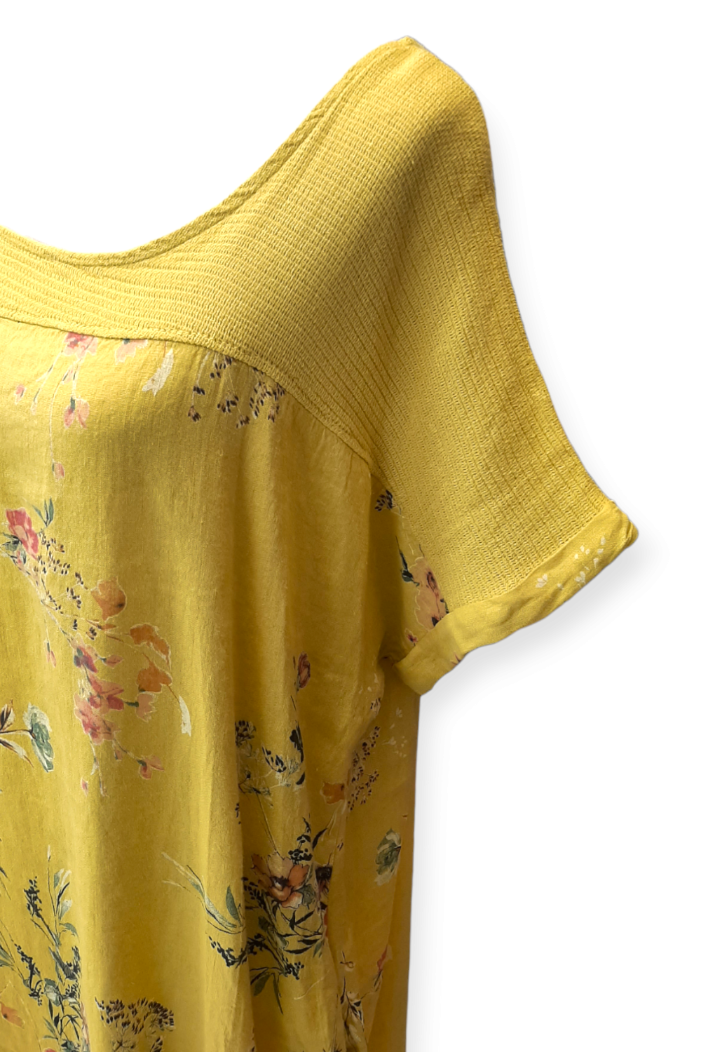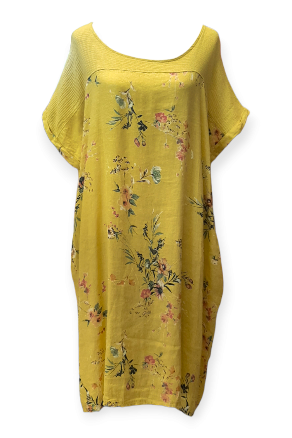 Keltainen kukallinen pellavamekko taskuilla. Yksi koko M-XXL. Rinnanympärys 140cm. Lantionympärys 148cm. Pituus 97cm.