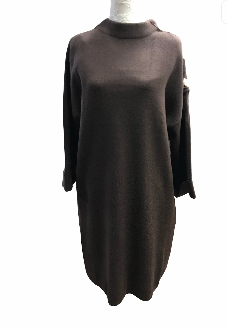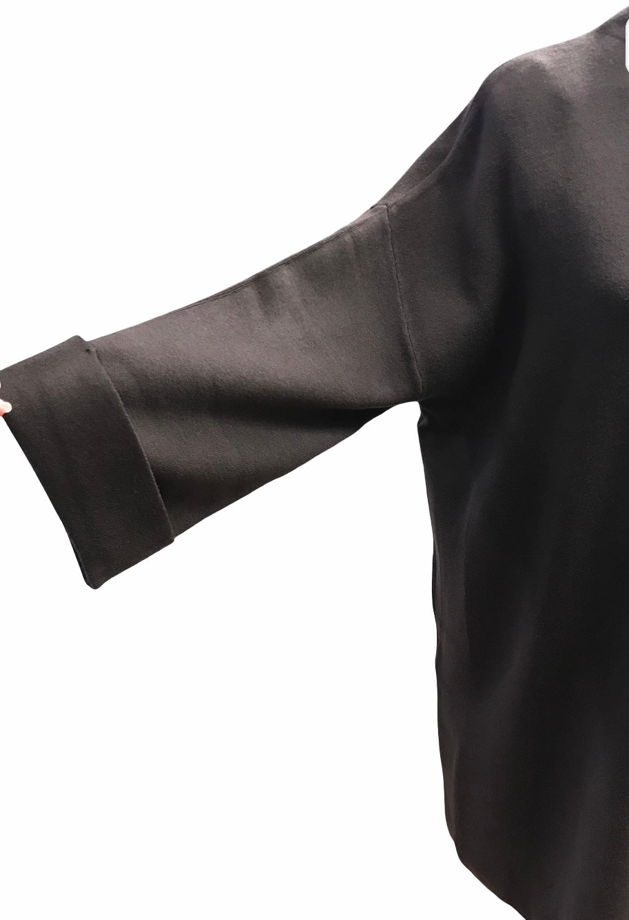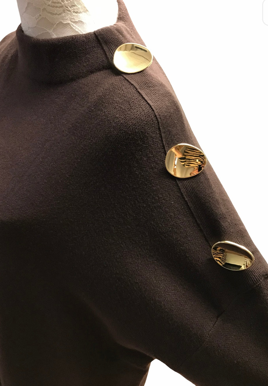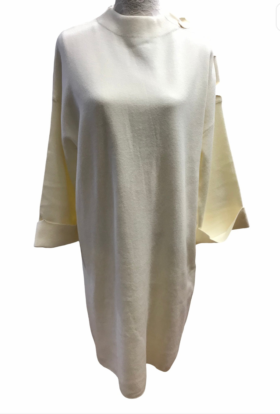 Upea neulemekko/tunika. Hihansuissa taitokset. Hihat 3/4. Toisessa olkapäässä kultaiset koristenapit.