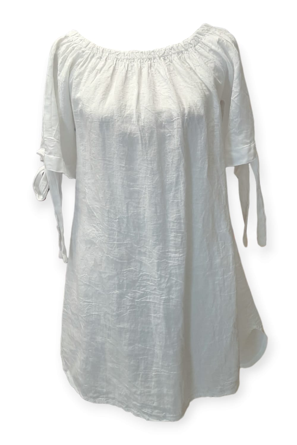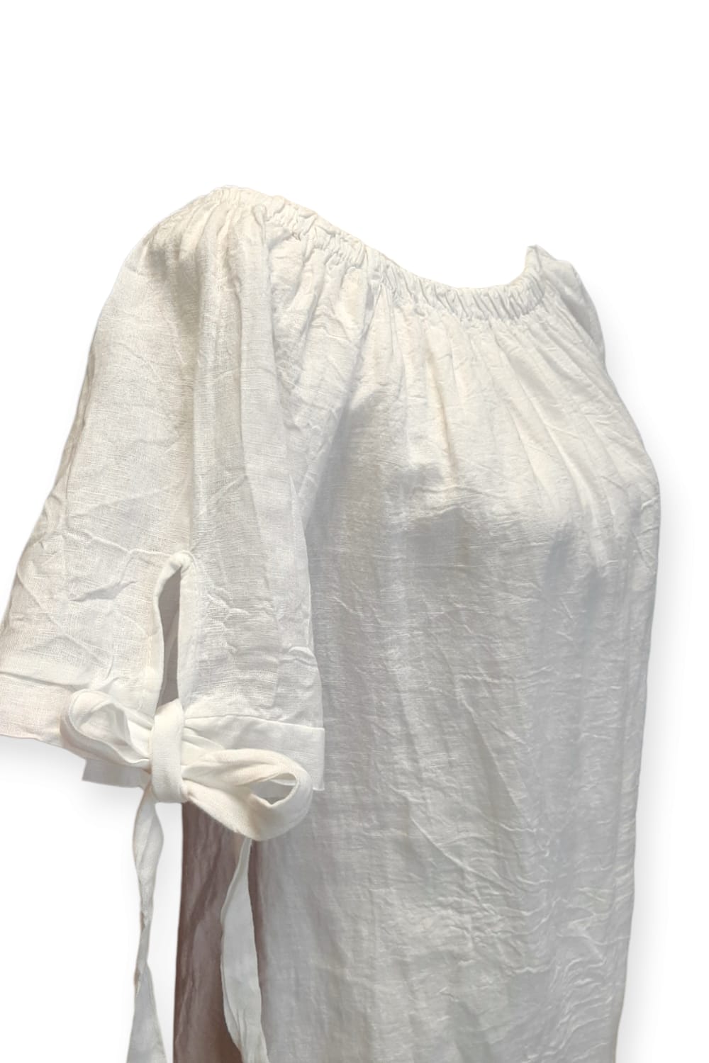 Valkoinen tunika, jossa kuminauharypytys kauluksessa ja solmimisnauhat hihoissa.